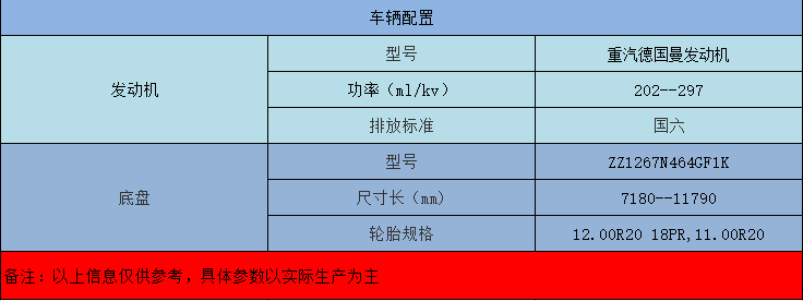 重汽德國曼發(fā)動(dòng)機(jī),7T-9T前橋,13T-16T后橋。
